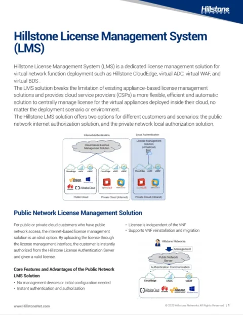 Hillstone License Management System (LMS) is a dedicated license management solution for virtual network function deployment such as Hillstone CloudEdge and virtual ADC. The LMS solution breaks the limitation of existing appliance-based license management solutions and provides cloud service providers (CSPs) a more flexible, efficient and automatic solution to centrally manage license for the virtual appliances deployed inside their cloud, no matter the deployment scenario or environment.